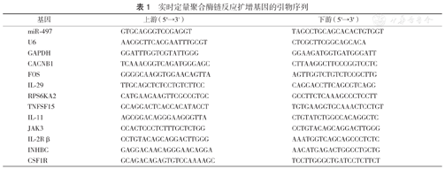 TRIzol法提取细胞总RNA,按照美国ABI公司反转录试剂盒说明反转录2 μg RNA,合成cDNA单链,然后以cDNA为模板进行PCR扩增。miR-497、U6反转录引物序列分别为5'-GTCGTATCCAGTGCAGGGT CCGAGGTATTCGCACTGGATAC-3'和5'-AACGCTTC ACGAATTTGCGT-3',其他PCR引物序列见表1。扩增体系为10 μl:SYBR Select Master Mix(2×)5 μl,10 μmol/L上、下游混合引物1 μl,cDNA模板2 μl,无核酶水2 μl。反应条件为:95 ℃ 2 min,95 ℃ 15 s,60 ℃ 1 min,40个循环。以GAPDH作为差异表达基因的内参,以U6为miR-497内参,qRT-PCR数据采用2-ΔΔCt相对定量法计算。