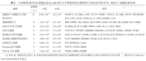 将绝对倍数变化3.0倍以上的差异表达基因上传至MAS 3.0系统(http://bioinfo.capitalbio.com/mas3/)进行GO分析,按生物学过程(biological process)、细胞组分(cellular component)、分子功能(molecular function)进行功能注释。在生物学过程分类中,HCT116细胞过表达miR-497后下调基因富集于免疫和炎症反应的基因共45个,占前十位GO分类的17%(图2)。对绝对倍数变化3.0倍以上差异基因行KEGG通路分析显示,HCT116细胞过表达miR-497后下调基因主要与细胞因子受体作用网络、细胞黏附分子、JAK-STAT、MAPK、钙等信号通路有关(P<0.05,Q<0.05)(表2),其中细胞因子受体作用网络、JAK-STAT、MAPK等通路与炎症反应相关。