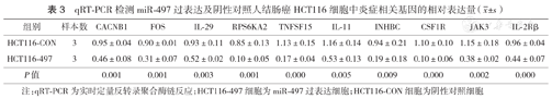 选取下调基因中参与细胞因子网络和MAPK信号通路的15个炎症相关基因进行PCR验证。结果显示,与HCT116-CON细胞相比,HCT116-497细胞中10个基因(CACNB1、FOS、IL-29、RPS6KA2、TNFSF15、IL-11、INHBC、CSF1R、JAK3和IL-2Rβ)表达水平降低(均P<0.05)(表3),与芯片结果一致。