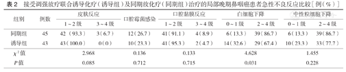 两组均未发生5级不良反应和4级非血液学不良反应。同期组与诱导组比较,2~4级白细胞下降比例高(P=0.031)。虽然同期组2~4级中性粒细胞下降及口腔霉菌感染比例均高于诱导组,但差异均无统计学意义(均P>0.05)。两组皮肤反应、黏膜反应及霉菌感染发生率差异均无统计学意义(均P>0.05)(表2)。