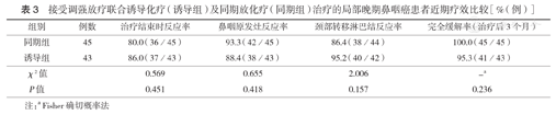 | 组别 | 例数 | 治疗结束时反应率 | 鼻咽原发灶反应率 | 颈部转移淋巴结反应率 | 完全缓解率(治疗后3个月) |