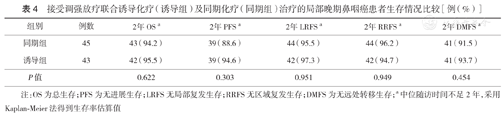 随访截至2016年3月11日,两组中位随访时间为18.5个月(4.2~32.7个月),共有7例患者失访(同期组5例,诱导组2例),同期组出现疾病进展6例,其中鼻咽复发1例,淋巴结复发1例,远处转移4例;诱导组疾病进展4例,其中鼻咽复发1例,淋巴结复发1例,远处转移2例。两组2年预期OS率、PFS率、LRFS率、RRFS率及DMFS率差异均无统计学意义(均P>0.05)(表4)。