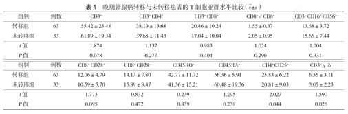 晚期肺腺癌转移与未转移患者的T细胞亚群水平比较(