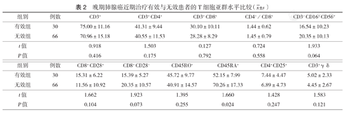 晚期肺腺癌近期治疗有效与无效患者的T细胞亚群水平比较(