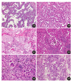 1A:贴壁为主型,癌细胞呈贴壁生长,无间质、脉管或胸膜浸润,无乳头或微乳头结构,肺泡腔内无癌细胞聚集;1B:腺泡为主型,主要成分为具有中心管腔的圆形或卵圆形腺体;1C:实性为主型,主要由片状多角型细胞组成,缺乏可辨认的腺癌结构,肿瘤呈100 %实性生长;1D:乳头为主型,主要由具有纤维血管轴心的分支乳头(箭头所示)构成;1E:微乳头为主型,肿瘤细胞形成无纤维血管轴心的乳头状细胞簇;1F:微乳头播散,视野内可见多个微乳头