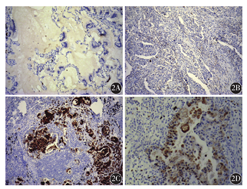 2A:腺癌细胞HIF-1α蛋白表达阴性;2B:实性分布肺腺癌细胞散在表达HIF-1α;2C:HIF-1α在肺腺癌淋巴结转移中的阳性表达,腺癌细胞胞质和胞核可见棕黄色颗粒;2D:HIF-1α在肺腺癌脑转移中的阳性表达