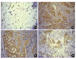 3A:正常支气管肺泡上皮细胞GLUT1蛋白表达阴性;3B:肺腺癌细胞GLUT1阳性表达;3C:GLUT1在肺腺癌淋巴结转移中的阳性表达,腺癌细胞胞膜和胞质可见棕黄色染色;3D:GLUT1在肺腺癌脑转移中的阳性表达