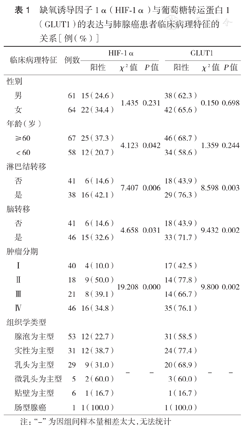缺氧诱导因子1α(HIF-1α)与葡萄糖转运蛋白1 (GLUT1)的表达与肺腺癌患者临床病理特征的关系[例(%)]