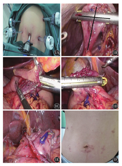 1A:左腋前线肋缘下2 cm处、左锁骨中线平脐处置入12 mm套管,右腋前线肋缘下2 cm处、右锁骨中线平脐处分别置入5 cm套管;1B:将十二指肠从后向前顺时针旋转90°(即1/4的肠管);1C:直线切割吻合器的钉仓和钉砧分别置入胃内和十二指肠,行胃后壁和十二指肠后壁吻合;1D:直线切割吻合器闭合共同开口;1E:吻合后吻合口的情况;1F:腹壁切口愈合后