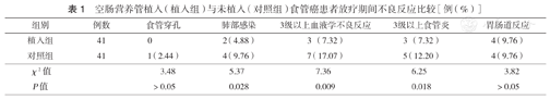 食管癌是一种高代谢状态的消耗性疾病。摄入充足的营养物质是保证治疗顺利进行的必要条件。在临床工作中常因忽视营养治疗,使得许多患者在存在营养风险的情况下接受治疗。放化疗对机体影响较大,易出现体质量减轻、放射性食管炎及血细胞计数减少等不良反应。肿瘤病灶所处的平滑肌弹性在放疗前就已经很差。经过放射线的刺激后,黏膜发生急性水肿,弹性消失、平滑肌收缩和蠕动功能丧失,原狭窄程度较前进一步加重,甚至出现完全性梗阻[3]。食管黏膜在放疗8~10次时完全破溃,进食后食物残渣与其直接接触,摩擦并刺激食管黏膜下层甚至肌层,引起明显的疼痛;水肿后狭窄的管腔及破溃的食管黏膜对食物残渣的吸附与肿物表面凹凸不平的腔隙,均减慢了食物通过病灶处的速度,导致了食物颗粒在局部长期残留,在厌氧菌作用下,进一步形成该区域的慢性感染性病变,延迟了组织的修复和创面愈合,严重者最终发生穿孔和出血[4]。而植入空肠营养管的患者,由于食物暂时不再从病变处通过,起到了"临时旷置"的作用,可避免食物通过病变处带来的刺激,主要体现在水肿期缩短、疼痛程度降低、慢性感染与穿孔和出血发生率下降[5]。陈超等[6]研究营养干预在食管癌放化疗患者中的疗效发现,实施营养干预后患者放化疗效果提升,且不良反应发生率降低。