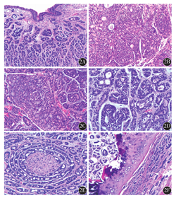 (1)大体标本:2例手术切除标本,肿瘤大小分别为2.0 cm×1.0 cm×0.8 cm和2.5 cm×2.0 cm×1.8 cm,表面无包膜,切面灰白色,质硬。(2)光学显微镜下观察:肿瘤组织位于气管或支气管黏膜下,呈浸润性生长。1例活组织检查标本以筛状结构为主,其余3例以腺管状、筛状、条索状和实性巢状结构混合。腺腔或筛孔内可见嗜碱性黏液样物质或嗜酸性基底膜样物质;实性巢状区中可见筛孔状结构,内含均一的嗜酸性基底膜样物质,灶区见小导管形成,内见嗜碱性黏液样物质,巢团周围细胞呈栅栏状排列,瘤细胞巢团周围间质内可见玻璃样变和黏液样变(图2A,图2B,图2C)。瘤细胞较小似基底细胞,形态大小较一致,核质比高,核深染,核分裂少见(仅1例核分裂>5个/10个高倍视野)(图2D),未见坏死。其中1例见肿瘤组织侵犯神经和支气管软骨(图2E、图2F)。2例手术切除标本切缘均见癌组织残留。