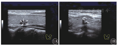 超声声像图显示,点状钙化组钙化灶呈低回声结节内点状强回声,散在分布,不伴声影和"彗星尾征"(图1A);片状钙化组钙化灶呈斑片状分布,位于结节边缘或中央,位于边缘可呈弧形,中央可呈簇状,常伴声影(图1B)。