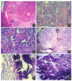 点状钙化:钙化灶通常位于肿瘤周边与肿瘤内,呈散在的点状分布,钙化灶之间有肿瘤组织或间质分隔(图2A);钙化灶呈圆形或卵圆形,边界清楚,直径约100 μm(图2B);高倍镜下钙化物嗜蓝染,颗粒较细,呈同心圆状的钙化小体(图2C)。片状钙化:钙化灶通常位于肿瘤周边与肿瘤内,呈片状分布,常伴有周围间质胶原化变性,通常肉眼可见(图2D);钙化灶呈带状、粗梁状。因周边通常伴有继发性改变,边界较清楚,分布宽度与长度不等(图2E);高倍镜下钙化物嗜蓝染,颗粒较粗,于钙化物断裂处可见层状结构的晶状体(图2F)。