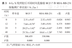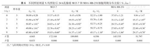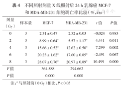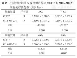 | 剂量(Gy) | 样本量 | MCF-7 | MDA-MB-231 | t值 | P值 |