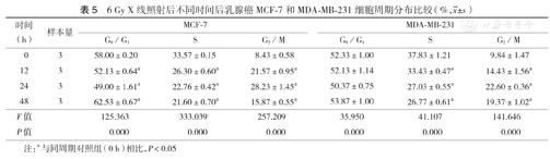 6 Gy X线照射后不同时间后乳腺癌MCF-7和MDA-MB-231细胞周期分布比较(%,