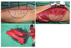 原发灶切除与皮瓣制取由两组医生同时进行。肿瘤切除依据病理性质、病变范围进行扩大切除,根据需要行颈淋巴结清扫术,注意解剖和保护受区血管蒂,如不需要淋巴结清扫,常规解剖颈部血管,制备受区血管,如甲状腺上动脉、面动静脉、颈外静脉及颈内静脉的属支等。