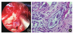 患者,女性,56岁,因右侧面部疼痛伴张口受限3年于2017年7月入我院。3年前无明显诱因自感右侧面部阵发性疼痛,可放射至同侧头部及眼眶,用力张口及咬合时疼痛明显加重,偶有右侧面部麻木感,无溢泪流涕、口角歪斜、闭眼乏力等不适。平时体健。当时外院拟诊为右侧颞下颌关节炎,给予抗感染及消炎镇痛药物治疗,自感疼痛减轻,但停药后反复加重,且渐感张口受限。于外院行右侧颞下颌关节磁共振成像(MRI)检查,未见明显异常。后来我院就诊,行鼻窦CT示:右侧翼腭窝间隙较对侧增宽(图1A、图1B),遂以"翼腭窝肿物"收住我院。患者住院后查体:张口受限,右侧面部肌力正常,鼻腔黏膜光滑,右侧颞下颌关节无明显压痛。进一步行翼腭窝增强MRI示:右侧蝶骨大翼、蝶骨体、上颌骨异常强化,考虑纤维骨化(图1C、图1D)。腮腺、颈部淋巴结、肝胆胰脾肾B型超声、胸部CT及颅脑CT检查均无明显异常。后全身麻醉下经鼻内镜右侧翼突径路翼腭窝间隙探查及肿瘤切除术,剪除部分中鼻甲开放上颌窦,磨除上颌窦后壁骨质及翼突根部,暴露翼腭窝间隙,显露上颌神经及翼管神经,见神经周围软组织包绕(图2A)。息肉钳咬取部分翼管神经周围软组织送快速冷冻病理示:可疑腺样囊性癌。进一步探查肿瘤累及翼内翼外肌,考虑到该肿瘤易沿神经血管走行,向患者家属交代病情及进一步手术风险后,根据患者家属意愿,应用鼻用动力系统及低温等离子射频消融清除可见癌灶及部分翼内外肌后停止手术。术后常规病理:光学显微镜下见肿瘤细胞成筛状、带状排列,筛网样结构内可见黏液样物质(图2B);免疫组织化学:CEA阳性,Ki-67阳性约10%,p40阴性,NSE阴性,SMA阳性,CK7阳性,符合腺样囊性癌。患者出院后外院行局部放疗(60 Gy),定期门诊复查1年,未见复发。