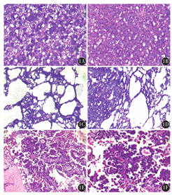 大体观察:肿物最大者5 cm×4 cm×3 cm,最小者0.4 cm×0.4 cm×0.2 cm。边界尚清,包膜不明显,部分为实性,少数病例为囊性,囊内见乳头状增生物,灰白色囊内有暗红液。显微镜下检查:(1)实体型(图1A):21例,占75%,其中6例为实体型混合微囊型,1例为实体型混合滤泡型,1例为实体型混合微囊及滤泡型。肿瘤呈膨胀性生长,瘤细胞间无明显纤维间质,低倍镜下为一嗜碱性细胞构成的肿瘤,主要由类似浆液性腺泡细胞的腺泡样细胞构成,瘤细胞排列成腺泡样,实性生长,细胞胞体大小不等,均含有丰富的胞质内嗜碱性颗粒,核位于近胞膜一侧,小而圆,核仁不明显。部分病例在实性生长区域微囊空隙形成,囊腔圆形或不规则形,大小不等。(2)微囊型(图1B):本组研究未发现单纯的微囊型,认为微囊型可能归属于实体型,只是在实体型基础上出现了微囊结构。(3)滤泡型(图1C、图1D):4例,占14.3%;此型低倍视野与甲状腺滤泡结构类似,不同于实体型,低倍视野下呈嗜酸性肿瘤改变。滤泡样腔隙大小不等,腔内充满粉染物,似胶质样物,衬覆单层立方或柱状上皮细胞,细胞核形态温和,无明显核仁,核分裂象罕见。(4)乳头囊状型(图1E、图1F):3例,占10.7%;表现为一大的囊腔内衬覆乳头状生长的肿瘤细胞,低倍镜细胞呈紫色(嗜双色),部分乳头见纤维轴心,特征性改变为乳头被覆鞋钉样细胞,细胞质丰富嗜双色性,核圆形温和,其间掺杂滤泡样结构,滤泡腔内有紫色分泌物,类似滤泡型肿瘤。囊内肿瘤细胞常脱落至管腔内,因此在不同的切片中有时只见纤维囊壁结构。