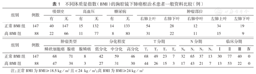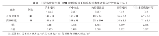 不同体质量指数(BMI)的胸腔镜下肺癌根治术患者临床疗效比较(