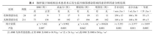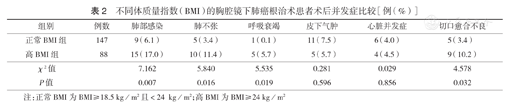 高BMI患者胸腔镜下肺癌根治术后肺部感染、肺不张、切口愈合不良的发生率高,术后恢复时间、拔管时间相对延长。高BMI是肺癌患者术后院内肺部感染的独立危险因素。