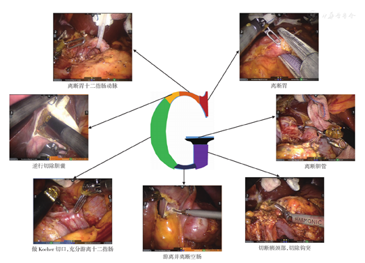 首先探查腹腔,随后游离右半横结肠系膜前叶和胃结肠韧带,将胃的系膜与结肠系膜分离,暴露胃网膜右动静脉,并在此时对第6组淋巴结进行清扫。剥离小网膜后将胃窦部提起,将与幽门相距2~3 cm的胃窦部以Endo GIA切割闭合器(美国Covidien公司)横断,适度游离胃体以便于后期吻合口重建。将残余胃体推至左上腹,使肝十二指肠韧带、胰腺颈部及肝总动脉充分暴露,便于下一步手术操作。在胰腺上缘行第8a组淋巴结的游离,肝总动脉此时自然显露。将肝总动脉与周围组织进行游离后悬吊,清扫第12组淋巴结,使胃十二指肠动脉和肝固有动脉骨骼化。将胃十二指肠动脉以Hem-o-lock Weck结扎夹(美国秦利福公司)结扎并切断,显露门静脉。逆行切除胆囊,显露胆总管。建立Kocher切口。游离十二指肠和部分空肠后将其自结肠系膜后方提至右上腹横断,以便胆肠吻合口的建立。确定并游离肠系膜上静脉后游离、切断胰颈部。将肠系膜上静脉牵向左侧以显露肠系膜上动脉,在其右侧紧贴动脉壁行钩突系膜的切除,切除时应注意保证系膜的完整性。近端腔镜下血管夹夹闭,远端丝线结扎,切断肝总管,切除标本。开始重建消化道。首先用改良的吻合口缝合方式进行胰肠吻合:上提空肠贴近胰腺残端。以3-0普理灵线(Prolene,美国爱惜康公司)在胰管两侧分别进行2个独立"U"形缝合,缝合应贯穿空肠的浆肌层和胰腺残端的全层。再适当切开空肠。用4-0普理灵线将胰管黏膜与空肠全层进行2针间断的缝合作为吻合口后壁。将胰管支撑管置入胰管延伸至空肠内,用5-0普理灵线行全层连续缝合。将胰腺与空肠全层用4-0普理灵线进行3针间断缝合作为吻合口前壁。对剩余胰腺断端进行适当加固,完成胰肠吻合。胆肠吻合口在胰肠吻合口前方大约10 cm处完成,胃肠吻合口在胆肠吻合口下方,结肠前方大约60 cm处完成。确认各个吻合口没有液体渗出后清洗腹腔进行关腹,完成手术。"G"形手术路径见图2。