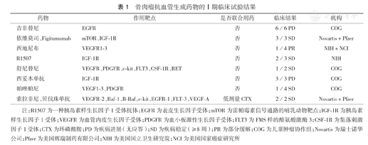 注:R1507为一种胰岛素样生长因子1受体抗体;EGFR为表皮生长因子受体;mTOR为雷帕霉素信号通路的哺乳动物靶点;IGF-1R为胰岛素样生长因子1受体;VEGFR为血管内皮生长因子受体;PDGFR为血小板源性生长因子受体;FLT3为FMS样的酪氨酸激酶3;CSF-1R为集落刺激因子1受体;CTX为环磷酰胺;PD为疾病进展(无应答);SD为疾病稳定(≥8周);PR为部分缓解;COG为儿童肿瘤协作组;Novartis为瑞士诺华公司;Pfzer为美国辉瑞制药有限公司;NIH为美国国立卫生研究院;NCI为美国国家癌症研究所