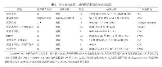 注:R1507为一种胰岛素样生长因子1受体抗体;CTX为环磷酰胺;PFS为无进展生存;DR为缓解持续时间;EFS为无事件生存;OS为总生存;ORR为总体反应(ORR=CR+PR+MR);SD为疾病稳定(≥8周);ISG为意大利肉瘤协作组;COG为儿童肿瘤协作组;Michigan university为美国密歇根州立大学;MSKCC为纪念斯隆-凯特琳癌症中心;SARC为肉瘤合作研究联盟