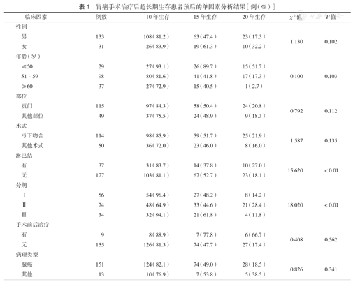 临床分期和有无淋巴结转移是影响胃癌术后超长期生存主要影响因素。