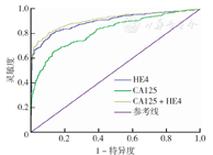 卵巢上皮性癌是妇科肿瘤死亡的首要原因[1]。糖类抗原125(CA125)被普遍应用于盆腔肿块良恶性的鉴别、卵巢上皮性癌的化疗效果及预后和复发的监测,灵敏度较高[1,2]。但在晚期卵巢上皮性癌和卵巢良性疾病中,80%患者CA125水平会升高,故特异性较低[3]。人附睾蛋白4(HE4)是近几年发现的一种新型肿瘤标志物,对卵巢上皮性癌的早期诊断有一定帮助,但灵敏度较低[4]。有研究显示CA125和HE4联合检测有利于提高卵巢上皮性癌诊断的特异度和灵敏度。本研究旨在探讨血清CA125和HE4联合检测对卵巢上皮性癌的诊断效能,以期指导卵巢上皮性癌的早期诊断及治疗,改善患者生存。