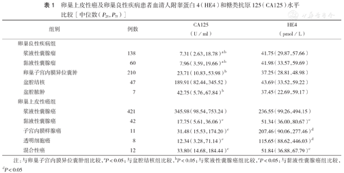 | 组别 | 例数 | CA125(U/ml) | HE4(pmol/L) | |
