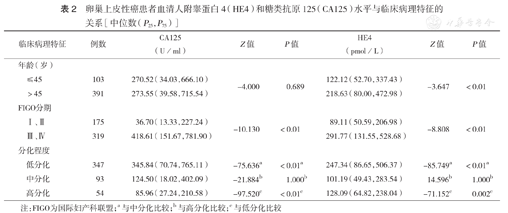 | 临床病理特征 | 例数 | CA125(U/ml) | Z值 | P值 | HE4(pmol/L) | Z值 | P值 | |