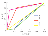 注:A为CEA+CA125+CA199+NSE+CYFRA21-1+pro-GRP;B为CEA+NSE+CYFRA21-1;C为FR+ CTC+CEA+NSE+CYFRA21-1;D为FR+ CTC;E为参考线;FR为叶酸受体;CTC为循环肿瘤细胞;CEA为癌胚抗原;CA为糖类抗原;NSE为神经元特异性烯醇化酶;CYFRA21-1为细胞角蛋白19片段;pro-GRP为胃泌素释放肽前体;亚厘米结节为经低剂量螺旋CT检查最大径≤10 mm的结节;FR+ CTC水平以新型配体靶向聚合酶链反应检测