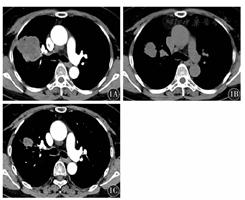 2015年WHO推荐对PSC患者采用组织学标本进行分子学检测,PSC中常见的突变基因为KRAS和TP53,EGFR突变比例存在差异。近年来,Liu等[5]在PSC中发现Met基因改变存在一种独特的高频改变,导致第14号外显子跳跃(exon14Δ),可能存在靶向意义。Fallet等[6]对81例PSC患者组织学标本行检测发现,最常见的突变基因分别是KRAS(27.2%)、EGFR(22.2%)、TP53(22.2%)、STK11(7.4%)、NOTCH1(4.9%)、NRAS(4.9%)以及PI3KCA(4.9%),而32例患者同时存在两种及以上突变基因。Mehrad等[7]对23例PSC患者病理组织检测发现,TP53、KRAS、ATM、EGFR、MET exon14Δ突变比例分别为74.0%、43.4%、17.3%、8.7%和11.1%。另一项对125例PSC患者的分子检测显示:74%患者存在TP53突变,34%存在KRAS突变,其他分子突变情况包括:Met(13.6%)、EGFR(8.8%)、BRAF(7.2%)、HER2(1.6%)、RET(0.8%)以及MET exon14Δ(12%)[8]。此外,研究发现相比普通NSCLC,PSC有着更高的程序性死亡受体配体1(PD-L1)阳性率(25%~69.2%),且PD-L1的表达与N2淋巴结转移、KRAS突变存在相关性[9]。本例患者治疗前常规行组织病理基因检测[未行程序性死亡受体1(PD-1)、PD-L1检测],结果仅存在EGFR突变(第19号外显子),与既往研究报道存在较大差异。