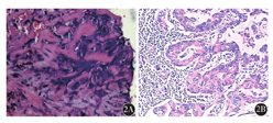 患者,女性,53岁,因右侧胸痛1个月余入我院。患者2017年6月无明显诱因出现右侧胸痛,无发热、咯血,无咳嗽、咳痰。既往体健,无吸烟史,无特殊基础病史。查体:体表面积1.51 m2,体能状态(PS)评分1分。神志清楚,精神尚可,浅表淋巴结未触及明显肿大。气管居中,颈静脉无怒张。双侧胸廓对称,双肺呼吸音清,无干湿性啰音及胸膜摩擦音。心率78次/min,律齐。实验室检查:血常规、癌胚抗原(CEA)、神经元特异性烯醇化酶(NSE)、细胞角蛋白21-1(CY21-1)、糖类抗原19-9(CA19-9)等均在正常范围;血生化:清蛋白39 g/L,谷氨酰转肽酶98 U/L,葡萄糖6.38 mmol/L,超敏C反应蛋白55.59 mg/L。胸部CT示:右肺上叶肿块,大小为6.4 cm×5.1 cm,考虑肺癌,右肺门及纵隔淋巴结轻度增大(图1)。头颅磁共振检查:右侧额叶及颞叶皮层下缺血灶,两侧上颌窦炎。外院上腹部CT检查示:左肾囊肿。进一步行肺穿刺活组织检查,病理免疫组织化学结果:AE1/AE(+++)、CK7(+/-)、p63(+)、p40(+)、CK5/6(少数+)、TTF-1(-)、NapsinA(-)、Ki-67(40%+)、SMA(-)、Desmin(-)、CD117(-)、CD34(血管+)、Vim(+)、S-100(+/-)。右肺为恶性肿瘤,分化程度差,倾向肉瘤样癌或多形性癌可能(图2)。临床分期cT3NxM0。肺组织基因检测示:表皮生长因子受体(EGFR)突变(第19号外显子);ALK、RET、ROS1、MET、HER2、KRAS、BRAF均未检测到突变;MYC基因扩增,TP53 C135Y突变,VEGFA基因扩增。经我院多学科综合诊疗(MDT)评估后,该患者于2017年7月19日开始接受化疗,方案为紫杉醇脂质体210 mg第1天+顺铂40 mg第1天至第3天,21 d为1个疗程,化疗2个周期。第1个周期化疗后肺部肿块缩小明显(图1B),2个周期化疗后肿块进一步缩小(图1),遂于2017年9月行VATS右上肺叶切除+淋巴结清扫术。术中切除右上肺叶,系统性清扫纵隔、肺门淋巴结。术后病理示:(右上肺)周围型结节型低分化癌(化疗后改变),大小为2.5 cm×2.5 cm×2.0 cm,显示低分化腺癌成分,癌成分占肿块的10%,坏死组织占肿块的90%,胸膜、支气管切缘、神经、脉管无侵犯,淋巴结0/14(图2)。术后病理分期:ypT1N0M0,ⅠA期。术后继续完成原方案2个周期辅助化疗,患者耐受差,终止进一步治疗,定期随访评估。截至2019年2月底,该患者未见复发转移,生命质量良好。