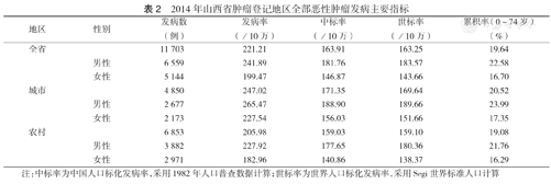 2014年山西省肿瘤登记地区全部恶性肿瘤发病主要指标