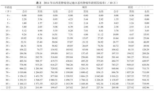 2014年山西省肿瘤登记地区恶性肿瘤年龄别发病率(/10万)