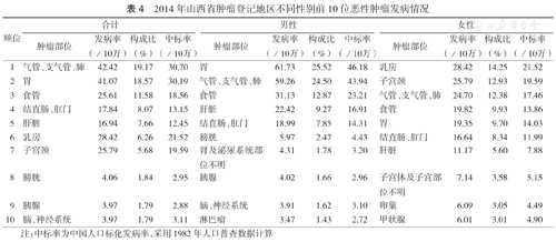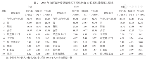 山西省肿瘤登记地区恶性肿瘤发病与死亡均以肺癌、上消化道恶性肿瘤和女性子宫颈癌为主,胃癌、子宫颈癌的发病率较高。