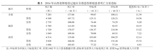 2014年山西省肿瘤登记地区全部恶性肿瘤患者死亡主要指标
