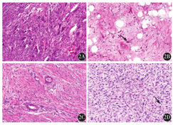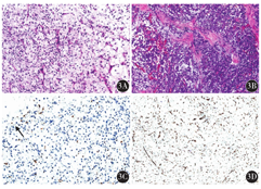 DDL约占脂肪肉瘤的18%,包括ALT/WDL向非脂肪源性的肉瘤成分转化,或偶尔向同源性的多形性脂肪肉瘤转化[7]。发病高峰年龄70岁,无性别倾向性[8],常为无痛性肿块。约90%的DDL为原发,10%为ALT/WDL多次复发后发生的去分化,任何部位的ALT/WDL均可发生去分化[9]。大多数(>75%)DDL位于腹膜后和盆腔软组织间隙内,其他部位包括肢体、精索/附睾区、胸腔、纵隔和头颈部(如喉、食管)等[10]。DDL瘤体通常较大,肿瘤直径最大可达60 cm,最小为2.5 cm[11],镜下为ALT/WDL区及去分化区,二者比例不定,去分化区不足1 cm时,称为微小去分化[12]。去分化成分与分化好的脂肪肉瘤成分的过渡形式有3种:(1)分界清楚,过渡突然;(2)逐渐过渡;(3)交错分布,呈马赛克样去分化。本组病例中3种形式均存在。去分化成分可表现为高级别去分化(90%)和低级别去分化(10%)。高级别去分化成分表现为高级别肉瘤形态,核分裂象>5个/10 HPF,但比相似的肉瘤少[13],最常见的是多形性未分化肉瘤样,以及高级别梭形细胞肉瘤(类似于纤维肉瘤)、高级别圆细胞肉瘤(类似于骨外尤文肉瘤或差分化滑膜肉瘤)、上皮样结构(类似于黑色素瘤、转移癌及间变性淋巴瘤等)[14]。低级别去分化成分表现为类似于低度恶性纤维黏液样肉瘤、纤维瘤病、低级别纤维肉瘤、炎症性肌纤维母细胞瘤以及孤立性纤维性肿瘤样等,核分裂象<5个/10 HPF。一个少见但有高度提示DDL作用的形态:围绕小血管的梭形细胞旋涡状结构,似脑膜瘤样结构,细胞似脑膜上皮细胞,但表达SMA。25%的病例高级别与低级别共存[11]。5%~10%的DDL发生异源性分化如骨、软骨、肌样分化(横纹肌、平滑肌),及少见的血管肉瘤样分化等[15]。需要与相似的去分化成分、异源性分化、同源性分化鉴别,如恶性外周神经鞘瘤、未分化肉瘤等。异源性分化如骨肉瘤、横纹肌肉瘤等。伴有同源性去分化时要与多形性脂肪肉瘤鉴别。所有需要与之鉴别的病变中,均缺少WDL区域,FISH检测缺少MDM2扩增,同时需要考虑患者年龄、发病部位及影像学表现[16]。