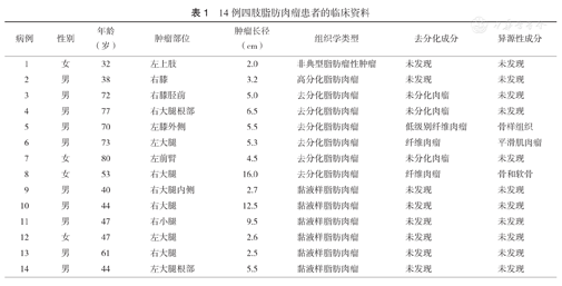 脂肪肉瘤是一种常见的具有脂肪细胞分化的软组织肉瘤,约占所有成年人肉瘤的20%[1]。脂肪肉瘤常发生于下肢深部软组织和腹膜后,分别占四肢肉瘤和腹膜后软组织肉瘤的24%和45%[2]。它由不同分化程度和不同异型程度的脂肪细胞组成,具有明显的形态多样性。我们对14例四肢脂肪肉瘤的临床病理特征进行了回顾性分析,总结脂肪肉瘤的临床特点、组织形态学特点、免疫表型及分子遗传学特点,旨在加深对不同类型脂肪肉瘤的认识,减少漏诊和误诊。
