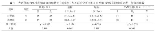 回顾性分析2017年5月至2018年12月海阳市人民医院、烟台市烟台山医院和烟台市海阳荣军医院收治的82例胆囊癌患者临床资料,按照用药情况分为观察组和对照组,各41例。纳入标准:(1)所有患者均符合中华医学会外科学分会胆道外科学组胆囊癌诊治指南[5],并经病理学检查证实;(2)均为既往未接受过放化疗的初治患者;(3)预计生存时间>3个月,有实体病灶且可进行测量。排除标准:(1)存在凝血功能异常;(2)存在心电图、肝肾功能严重异常;(3)对化疗药物变态反应或有禁忌证;(4)伴发中枢神经系统转移。两组患者性别、病程、年龄、分期等一般资料比较,差异均无统计学意义(均P>0.05)(表1),具有可比性。