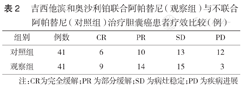 对照组患者接受吉西他滨联合奥沙利铂方案化疗:吉西他滨1 000 mg/m2,配制于0.9% NaCl溶液中,30 min静脉滴注,第1、8天;奥沙利铂100 mg/m2,配制于5%葡萄糖溶液中,3 h静脉滴注,第1天。治疗3周休息1周,为1个周期,共进行2个周期治疗。观察组在对照组的治疗方法基础上联合甲磺酸阿帕替尼治疗,阿帕替尼500 mg/d,1次/d,餐后30 min口服,2个月为1个周期,连续治疗2个周期。治疗2个周期后进行疗效评价。