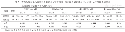 治疗前两组患者血清肿瘤标志物VEGF、sIL-2R、CEA、Dickkopf-1水平比较,差异均无统计学意义(均P>0.05),治疗后观察组4项指标的水平均低于对照组,差异均有统计学意义(均P<0.05)(表3)。