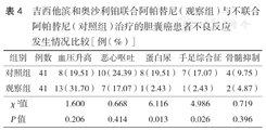 两组患者间血压升高、恶心呕吐、骨髓抑制发生率差异均无统计学意义(均P>0.05),观察组患者蛋白尿、手足综合征发生率均低于对照组,差异有统计学意义(均P<0.05)(表4)。