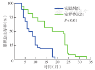 至随访结束,中位随访时间为20.4个月。安罗替尼组总生存时间为(22.8±1.0)个月,安慰剂组为(10.3±0.9)个月,差异有统计学意义(P<0.01)(图1)。