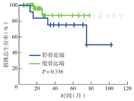文献[34]报道肿瘤部位是影响恶性骨肿瘤预后的重要因素。胫骨近端肿瘤预后明显好于其他部位,这与胫骨近端软组织覆盖少,容易早期发现肿瘤有关。本研究中胫骨近端肿瘤患者5年总生存率(74.07%)高于股骨远端肿瘤患者(46.21%)。是否合并病理骨折及化疗灵敏性也是影响肿瘤学预后的因素。本研究中仅1例患者合并病理骨折。骨肉瘤、恶性纤维组织细胞瘤患者采用多剂量联合新辅助和辅助化疗。术后患者生存率和肢体功能总体满意。