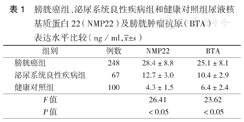膀胱癌作为泌尿系统最常见的恶性肿瘤,具有多中心、易复发及浸润性生长等特征,其发病率和死亡率呈逐年上升趋势[1,2]。膀胱癌难诊断、易复发、进展快、治疗费用高,尽早诊断及治疗是降低膀胱癌死亡率和提高患者生命质量的关键。目前诊断膀胱癌的金标准是膀胱镜检查,虽然诊断率较高,但属于有创操作,患者耐受性差,不适合用于普查。尿液脱落细胞学检查虽简便,但灵敏度较低[3]。B型超声、CT诊断肌层浸润性膀胱癌准确率较低,难以发现原位癌[4]。尿液核基质蛋白22(NMP22)作为核基质蛋白家族特殊的一员,与膀胱癌的进展程度呈正相关,可以作为膀胱癌诊断的标志物[5]。膀胱肿瘤抗原(BTA)是一种膀胱镜的补充检测手段,是诊断膀胱癌的敏感标志物[6]。目前NMP22及BTA联合诊断膀胱癌鲜有报道。本研究旨在探讨NMP22联合BTA检测对膀胱癌的诊断价值。