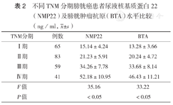 不同TNM分期膀胱癌患者尿液核基质蛋白22 (NMP22)及膀胱肿瘤抗原(BTA)水平比较(ng/ml,