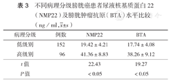 不同TNM分期和病理分级的膀胱癌患者尿液NMP22和BTA水平组间比较,差异均具有统计学意义(均P<0.05)(表2、表3)。