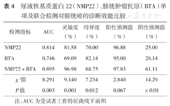 | 检测指标 | AUC | 灵敏度(%) | 特异度(%) | 阳性预测值(%) | 阴性预测值(%) |
